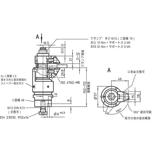 카탈로그 품번:23320.0012 특징: ●가공중의 워크의 진동을 억제합니다. ●워크의 리브나 혀 모양의 부분등을 클램프 할 수 있어 주물등의 1차 가공시에도 워크를 변형시키지 않고 클램프 할 수 있습니다. ● 23320.0012, 23320.0016은 클램프 너트를 조이면 워크가 고정되고 동시에 실린더 본체의 상하 방향이 고정됩니다. ● 23320, 0014는 워크와 실린더 본체는 별도의 클램프 너트로 고정됩니다. 용도 : ● 공작물을 지그에 3 점으로 고정 한 후, 삐걱 거리는 진동이 일어나기 쉬운 부분을 특히 클램프하고 유지하는 데 사용. 사양:●높이(mm):Max 177●선회 방향・각도:좌우 110°●스트로크(mm):12●클램프력(kN):8●설치 나사(mm):M12●8kN(30Nm) ●스토퍼(적색 커버)의 세로 방향과 회전 방향의 위치를 조정해, 3개의 세트 나사로 고정한다(육각 렌치는 2면폭 2.5 mm). ●상방향에는 충분한 여유를 가지고 고정하는 것(워크의 치수 공차가 있으므로). ● 취급 클램프의 순서 : 플로팅 클램프의 구금 부분 전체를 밀어 내린다. ●구금 부분을 돌려 워크를 끼우는 위치에 가져온다(스토퍼의 위치를 미리 조정해 둔다). ● 손을 떼면 아래쪽의 입금이 작은 스프링력으로 워크에 접촉한다. ●육각 너트(이면폭 18mm)를 조인다(최소 토크 15Nm, 최대 토크 30Nm). ● 이 때에 워크가 클램프되는 동시에, 구금 부분 전체가 상하 방향으로 고정된다. ●클램프의 해제는 이 반대의 순서. ●표준구금 부착 재질/마무리: ●하우징:알루미늄, 적색산화피막처리 본체 담금질강 ●본체: 담금질강, 질화처리, 망간·인산염처리, 연마 ●구금: 담금질강, 질화처리, 망간·인산염 처리 지구멍은 M12 x10의 볼트 등을 사용하여 항상 막아야 합니다.
