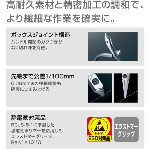 카탈로그 품번:P-51 특징:●첨단까지 공차 1/100mm의 고정밀도입니다. ● 유리판에 딱 붙은 φ0.08mm의 극세 구리선을 손잡이 올릴 수 있습니다. ● 손에 익숙한 엘라스토머 수지 그립입니다. 용도: ● 정밀 작업에 최적. 사양:●전장(mm):125●A(mm):38●선단 두께(mm):1 ●선단:기자 없음 ●선단 두께(mm) :1 ●스프링 부착 ●ESD 관리치:Rg<1×10[[의 12승]]Ω ●경도:46HRC 재질/마무리:●공구강 ●그립