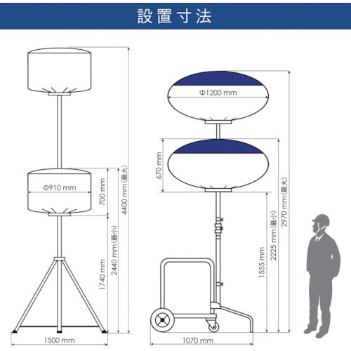 카탈로그 품번:BL-500-BSS 특징: ●세세한 높이를 조정할 수 있는 핸들식입니다. ●전등・반등의 2단계 조광이 가능합니다. ●견고한 삼각 장비입니다. ●풍선 타입이므로 전방위를 드라이버나 작업자에게 「눈부시지 않는 상냥한 빛」으로 밝게 비춥니다. ● 순간적으로 점등하므로 긴급시 등에서도 도움이됩니다. ●LED 때문에 에너지 절약・장수명 발전기에서의 사용 시간도 종래에 비해, 훨씬 늘고 있습니다 ●용도에 맞추어 높이의 조정이 가능합니다. ● 자외선량이 형광등의 200분의 1로, 적외선도 거의 나오지 않고 벌레가 다가가기 어렵습니다. ●LED 부분은 유닛식이 되어 있어 만일 파손된 경우에도 개별적으로 교환이 가능합니다. ● 종래의 메탈 할라이드 램프에 비해 저발열・저전력・고수명입니다. 용도: ● 공사용 조명, 도로 교통의 빛에, 비상용 비축품에. ●자치단체의 축제, 이벤트용 조명에. ● 불꽃 놀이 등 각종 회장에. ● 신사 불각의 길가 등에. ●임시 주차장 등에. 사양:●밝기(lm):72000●폭(mm):1500●안길이(mm):1280●높이(mm):2410~4370●코드 길이(m):8●소비 전력(W):490●전원(V):AC100 ●본체 치수(mm) 폭:1500●본체 〜4370●전원(V)(50/60Hz):AC100●발광 효율(lm/W):150●전압(V):100〜240●가로(mm):1500●구 수명(시간):50000●보호 등급:IP55 ●전원 코드 길이(m):8 ●색온도(K):5000 ●조사각(°):360 ●풍선 최대고(mm):4370 ●풍선 직경(mm):1200 ●정격 수명(시간):50000 ●타입:반사 대형 삼각 ●전선 길이(m):8 ●전선 길이 (mm)폭×안길이×높이:1500×1280×2410~4370 ●조사 범위: 360° ●보호 등급: IP55 ●구 수명: 약 50000시간 ●전선종: VCT 코드×3심 방수 플러그 첨부 ●소비 전력:432W(전등) /216W(반등) ●조광 기능 있음 세트 내용/부속품:●삼각대 백×1 등구용 백×1