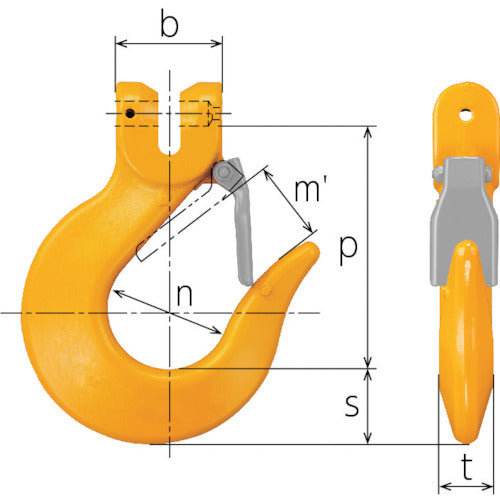 카탈로그 품번 : VSL4100 특징 : ● 키토 체인 슬링 100 용 슬링 후크입니다. 용도 : ● 안전 레버가 달린 스티어링 하측 훅. 사양:●기본 사용 하중(t):3.2●체인 선경(mm):10●적합 체인 선경(mm):10●치수(mm)b:54●치수(mm)m:39●치수(mm)n:56●치수(mm)p:119●치수(mm)s:37.5●치수(mm)t:9.2●치수 훅치수(mm)p:119●사용하중(t):3.2●슬링 훅치수(mm)n:56●치수(mm)m':39 재질/마무리:●합금강