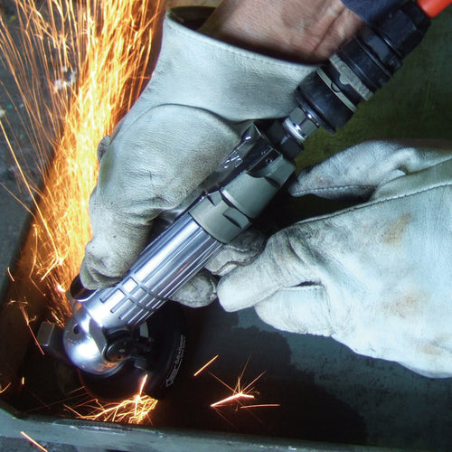 카탈로그 품번:GR-M58(75)KL 특징:●숫돌 직경 58mm・75mm 대응의 에어 그라인더에 스핀들 락을 장착하고 있습니다. ● 스패너를 사용하지 않고 안정적으로 숫돌 교환이 가능합니다. ●하이파워・고토크 사양으로, 건간 깎아도 멈추기 어렵습니다. ● 컴팩트하고 세련된 알루미늄 바디입니다. ● 지금까지 포기하고 있던 곳에도 도착합니다. ● 초경량이므로 부담이 적습니다. ●소음 필터를 갖추고 있으므로, 하이 파워에서도 조용합니다. ● 100mm 그라인더에서는 작업하기 어려운 세부 · 좁은 부분의 연삭 연마 작업을 효율적으로 실시할 수 있습니다. 사양: ●무부하 회전수(min[[의 -1승]]):12500 ●공기 소비량([[M3]]/min):0.54 ●호스 설치구:RC1/4 ●스위치 방식:레버 세트 내용/부속품:●호일 너트 분리용 육각 렌치(대변 5 mm) ●보호 커버 교환용 육각 렌치(대변 3 mm) ●58 mm용, 75 mm용 호일 너트 ●58 mm숫돌용 어댑터 ●75 mm용 호일 와셔 .