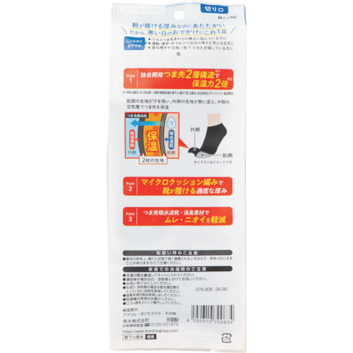 카탈로그 품번:576-806-26-90 특징:●특허 기술 취득, 독자적인 「발가락 2층 구조」로 실감할 수 있는 따뜻함을 실현하고 있습니다. 사양:●색:블랙 ●사이즈(cm):25~27 ●사이즈:25~27CM 재질/마무리: ●아크릴 ●폴리에스텔 ●그 외