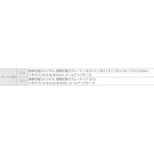 카탈로그 품번:227 특징:●조인트부는 가도식으로, 조속한 때는 스트레이트로, 강하게 조이고 싶을 때는 90°로 구부려 사용할 수 있습니다. ● 그립은 나무와 코튼에서 태어난 자연 소재를 포함한 CAB (셀룰로오스 아세토 부티레이트)로 만들어져 있습니다. ● 그립은 피부에 부드럽게, 잡는데 이상적이며, 내충격성이 뛰어나 또한 손질도 간단합니다. 사양:●날끝:플러스:PH1, PH2, PH3 육각:3mm, 4mm, 5mm, 6mm, 8mm ●세트 내용(책):8