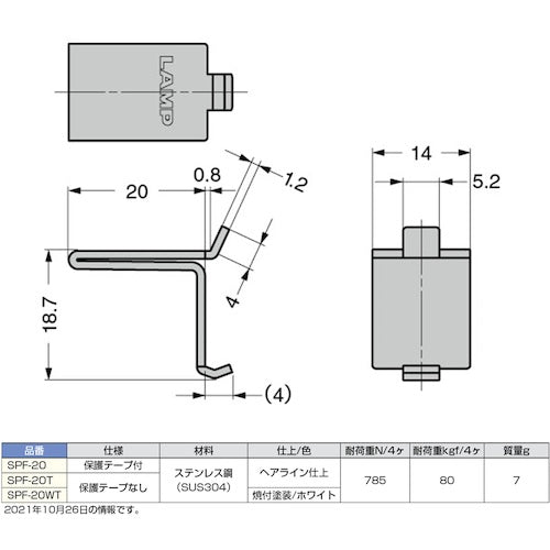 카탈로그 품번:SPF-20T 특징:●스테인리스강제 선반기둥 SP형, SPS형 전용의 선반수입니다. ● 선반에 설치할 때 "딸깍"과 클릭감을 얻을 수있어 설치가 확실하게 할 수 있습니다. ●박형 형상이므로, 수납물의 방해가 되지 않고, 책장등의 사용에 최적입니다. ●헤어 라인 마무리는, 보호 테이프 첨부와, 현장에서의 수고가 없어 쓰레기가 나오지 않는 보호 테이프 없음의 사양이 있습니다. 사양 : ● 폭 (mm) : 14 ● 품명 : 스테인레스 스틸 선반 받기 ● 길이 (mm) : 20 ● 타입 : 보호 테이프 없음 ● 내하중 (N / kgf) : 785 / 80 (4 개 사용시) ● 내 하중 (kgf) : 45 (4 개 사용시) ● 헤어 라인 마무리 주의 하시기 바랍니다 ● 이미지는 같은 시리즈의 제품 중 하나이며, 제품 번호와 외관이 다를 수 있습니다.