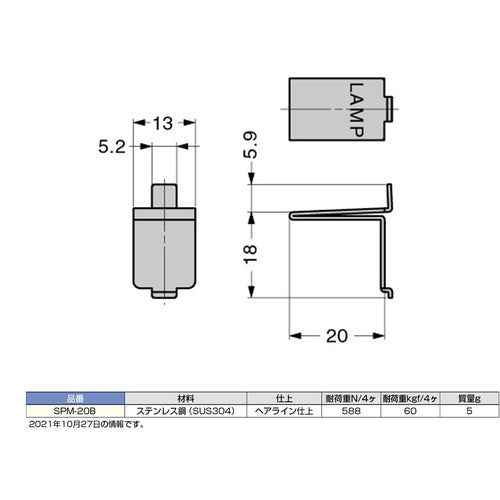 카탈로그 품번:SPM-20B 특징:●스테인리스강제 선반기둥 SM형 전용의 선반수입니다. ●박형 형상이므로, 수납물의 방해가 되지 않고, 책장등의 사용에 최적입니다. 용도 : ● 가구, 캐비닛 등의 선반 설치에. 사양 : ● 폭 (mm) : 13 ● 품명 : 스테인리스 강제 선반 받침 ● 길이 (mm) : 20 ● 타입 : SM 형용 ● 내하중 (N / kgf) : 588/60 (4 개 사용시) ● 스테인레스 강제 선반 SM 형 전용 선반 받침. ●내하중은 선반 1장당(선반 4개 사용)의 수치. ●구조상, 선반기둥의 각인 12번을 숨기는 설치 방법은 할 수 없습니다. 재질/마무리: ●스테인리스강(SUS304) 주의: ●구조상, 선반기둥의 각인 12번을 숨기는 설치 방법은 할 수 없습니다 ●내하중은, 선반판 1장당(선반수 4개 사용)의 수치입니다 ●선반판과 선반기둥의 틈은, 1mm 이하로 해 주세요