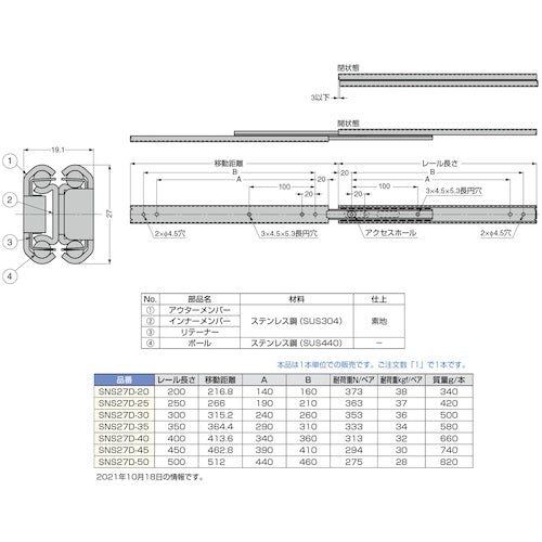카탈로그 품번:SNS27D-40 특징:●올 스테인리스강제로 내식성이 뛰어납니다. ● 이너 레일을 완전히 꺼낼 수있는 3 단인 슬라이드 레일입니다. 사용: ● 서랍에. 사양: ● 폭 (mm) : 19.1 ● 높이 (mm) : 27.0 ● 길이 (mm) : 400.0 ● 이동 거리 (mm) : 413.6 ● 정격 하중 (N) 쌍 / 수직 : 313 ● 타입 : 올 스테인리스 ● 레일 길이 L (mm) : 400 ● 스트로크 길이 S (mm) : ● 레일·이너 레일·중간 레일·리테이너:스테인리스강(SUS304) ●볼:스테인리스강(SUS440) 주의:●화상은 동 시리즈의 어느 하나의 제품이며, 이 품번의 것과는 외관이 다를 가능성이 있습니다.