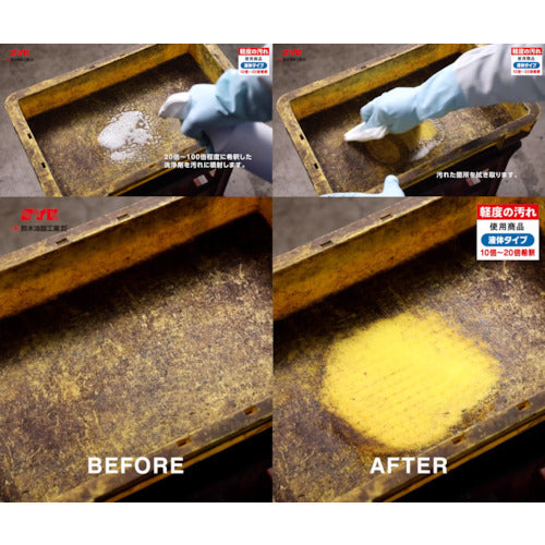 카탈로그 품번:S-603 특징:●알칼리성의 탈지 세정제로 각종 공작기계, 부품등의 금속의 기름 더러움이나, 손목 더러움, 담배의 야니의 세정에 적합합니다. ● 더러움에 따라 원액 ~ 물로 100 배 희석하여 사용하십시오. 용도: ● 공장・사무소 등의 기름 얼룩, 담배의 야니 세정. 사양:●용량(L):20●희석배율:원액~물로 100배 희석●액성:알칼리성●색:청색●액성:알칼리성