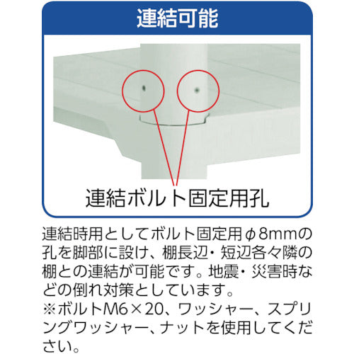 카탈로그 품번:TPT-K2233C-BK 특징:●다리는 선반에 원터치로 수납 가능합니다. (선반 1장당 다리 4개 수납 가능) ●다리부에는 쓰러져 대책으로서 볼트 고정용의 구멍을 마련해, 선반 긴변·단변 각각 옆과의 연결을 할 수 있습니다. ●플라스틱제이기 때문에 경량, 또 공구 불필요로 조립도 간단합니다. ●선반판 표면에 시보 가공을 풀어 짐의 어긋남을 경감합니다. 사양:●간구(mm):800●안길이(mm):350●높이(mm):697●유효간구(mm):652●색:블랙●선반단수(단):3●균등 적재량(kg/단):50●최대 적재량(kg/대):150 PP) 세트 내용/부속품:●코너 캡(4개) 주의:●집중 하중이 되면 내하중 능력은 반감합니다. 반드시 균등하게 하중을 분포시켜 사용해 주십시오. ●균등 적재량은, 23℃의 환경하에서의 설정 수치가 됩니다. 이용되는 환경의 온도에 따라 내하중 능력이 변화합니다.