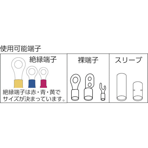 카탈로그 품번:TAP-2 특징:●절연 압착 단자, 알몸 압착 단자・PB 슬리브의 압착, 나아가 볼트나 전선의 절단, 전선의 스트리핑(껍질 벗김)이 이 1개로 가능한, 편리한 멀티 압착 툴입니다. 용도 : ● 자동차 정비, 배선 등의 단자 압착에. 사양:●전장(mm):235●압착 단자([[MM2]])알몸 단자용:1.25, 2, 5.5●압착 단자([[MM2]]) 절연 단자용:1.25, 2, 5.5 재질/마무리:●본체:스틸 ●그립:수지