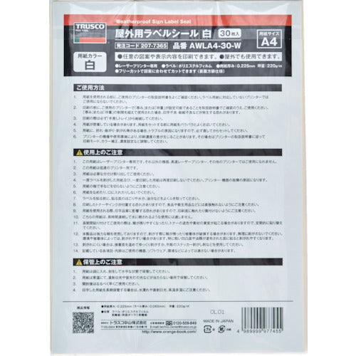 TRUSCCO 옥외용 라벨 씰 A4 흰색 30장입 AWLA4-30-W 1권