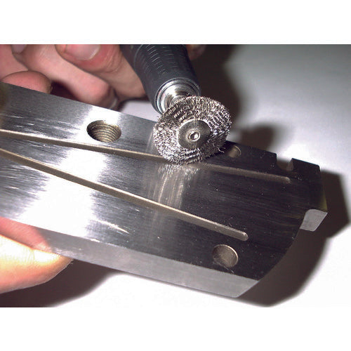 카탈로그 품번:203H-3 특징:●축 부착이므로 설치 교환이 용이합니다. ●컴팩트하고 고속 회전을 위해 조작하기 쉽고, 작업성이 뛰어난 평형 브러쉬입니다. 용도 : ● 미세 홈, 코너 조정, 요철, 파이프의 내면 연마. ●사용 공구:변속식 전동 마이크로 그라인더. 사양:●선경(mm):0.10 ●모재:놋쇠 ●외경(mm):20 ●축길이(mm):40 ●축경(mm):3 ●최고사용 회전수(rpm):15000 ●적요:놋쇠, 구리제품 및 합금 제품의 연마 ● 에어 툴은 사용할 수 없습니다. ●최대사용 회전수 이하로 사용해 주십시오. ●안전하게 이용하기 위해서 보호구를 착용해 주세요.