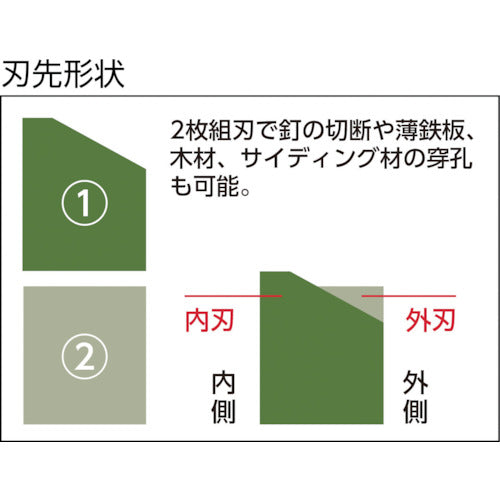 카탈로그 품번:ES-F35ST 특징:●내날 선행의 2매조 칼날로, 금속 붙이 사이딩재나 스테인리스 목재,(금속+단열재+합판)등의 복합재도 한발로 드릴 가능합니다. ● 목질 계재의 천공은 칩의 배출이 좋기 때문에 못의 절단, 박철판의 겹쳐 절단도 가능합니다. 용도: ● 피삭재: 금속계 사이딩 보드, 2×4(네일도 절단), 목재, 합판, PVC판, FRP 등. 사양:●날 직경(mm):35●유효 길이(mm):150●날 두께(mm):3●샹크 지름(mm):10・13겸용●적합 기종:전기 드릴・진동 드릴(회전 모드)●전장(mm):270●샹크:삼면취(스트레이트) 진동, 타격은 걸지 않도록 부탁드립니다.