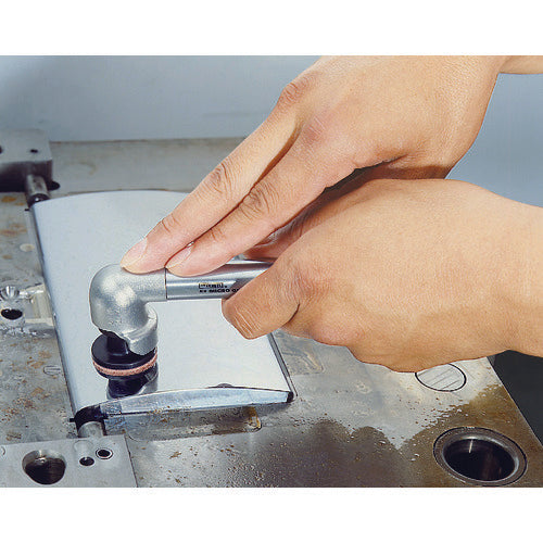 카탈로그 품번:GT-MG25-12CF 특징:●장시간의 사용으로도 지치지 않는 소프트 그립입니다. ●연삭분이 비산하지 않는 후방 배기 방식입니다. 용도: ●평면 연삭·연마용. ● 커터 마크 제거 등의 각종 평활 연삭. ●경면 마무리 등. 사양:●무부하 회전수(min[[의 -1승]]):25000 ●공기 소비량([[M3]]/min):0.25 ●호스 설치구:Rc1/4 ●배기:후방 ●전장(mm):181 :0.6MPa ●적합 숫돌:지름 30mm(M7×0.75)