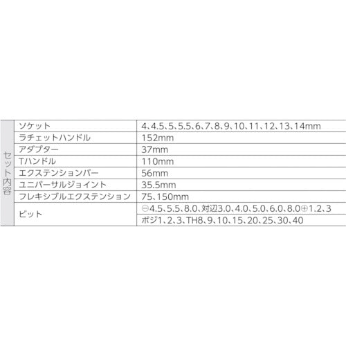 카탈로그 품번:003533 특징:●익스텐션 바와 축부의 공회전 기능에 의해 공구의 회전을 원활하게 실시할 수 있습니다. ● 헤드의 각도도 조정 가능합니다. ●기어수가 72장으로 많기 때문에, 세세한 이송으로 미세 조정이 가능합니다. ● 헤드부에 정역 스위치가 붙어 있습니다. 사양:●삽입각(mm):6.35 ●소켓 내용(mm):4, 4.5, 5, 5.5, 6, 7, 8, 9, 10, 11, 12, 13, 14 세트 내용(점):42●소켓 내용:4~14mm