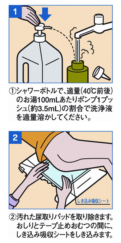 · 헹굼이 필요없는 간편한 케어. 샤워 병에 적당 온도(40℃ 전후)의 온수당 300mL당 세정액 펌프 1 푸시(약 3.5mL)를 희석해 주세요.