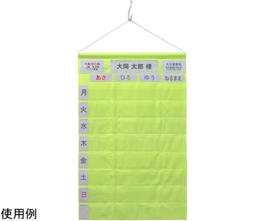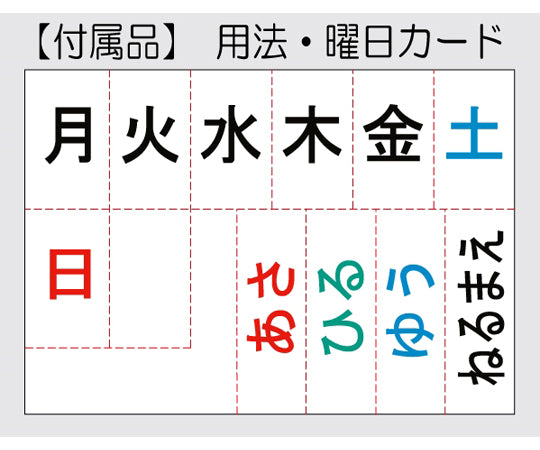 商品構成:本体、ヒモ、ヒモ通し棒、用法・曜日カード