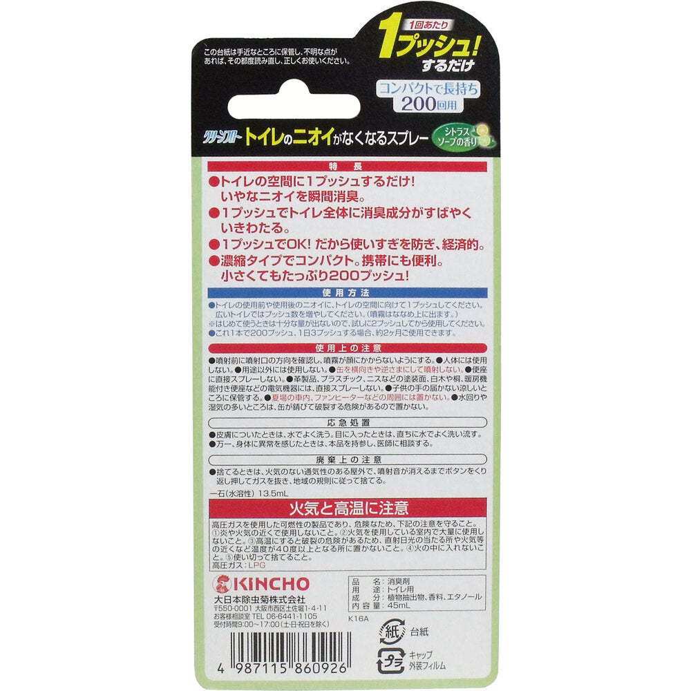 【アウトレット】クリーンフロー トイレのニオイがなくなるスプレー シトラスソープの香り 200回用 1 個