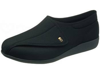 〇面ファスナーが大きくガバッと開き、脱ぎやすく履きやすい、男性向けシューズ。