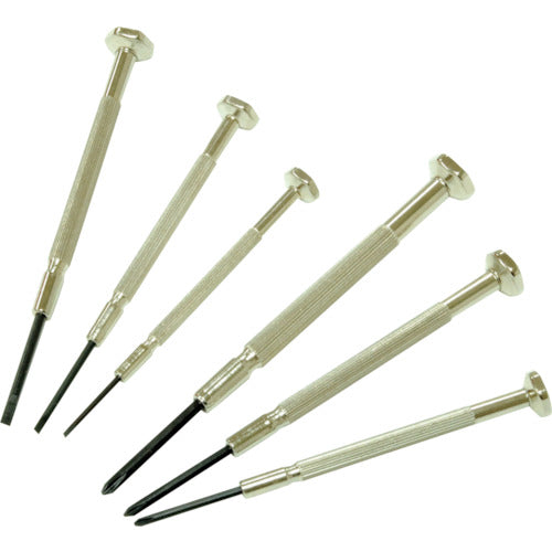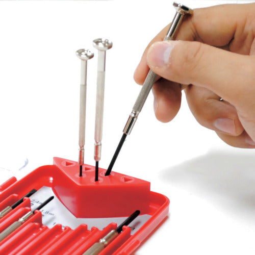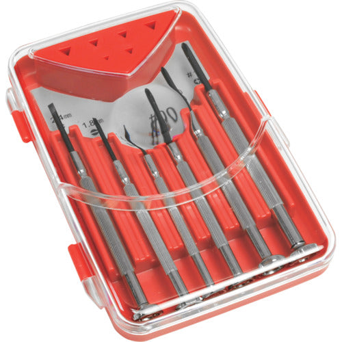 カタログ品番:2002000024428 特長:●メガネや時計、精密機器などの小さなネジを回す、精密ドライバーのセットです。●グリップエンドが回転するので、簡単に早回しが可能です。●収納に便利なケース付きで、作業時にはドライバーを立てるスタンドとしても使用できます。 仕様:●[PH00]全長:89mm、重量:9g、軸長:22mm●[PH0]全長:99mm、重量:13g、軸長:27mm●[PH1]全長:108mm、重量:19g、軸長:39mm●[SL1.4]全長:80mm、重量:6g、軸長:18mm●[SL1.8]全長:90mm、重量:9g、軸長:23mm●[SL2.4]全長:101mm、重量:13g、軸長:27mm