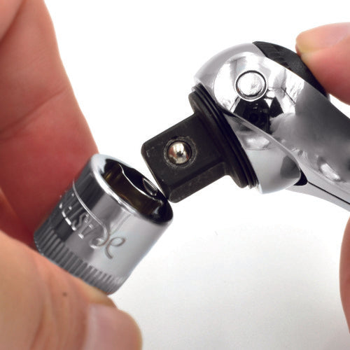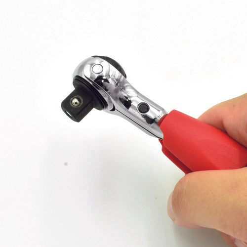 カタログ品番:2002000028976 特長:●ヘッド部が約180°回転するラチェットハンドルです。●使い方に合わせてハンドル部をT型とストレート型にすることができます。●1本で2通りの使用方法ができますので作業の幅が広がります。●角度をつけてソケットが回せるので通常ではアクセスしづらい箇所の作業に適しています。●72ギアのラチェットは滑らかに動きクロムメッキ加工で美しく仕上がっています。●ソケットの着脱が容易なプッシュリリースタイプです。 仕様:●全長(T型ハンドル/ストレート型ハンドル):100/130mm●ハンドル長:86mm●重量:143g●差込角:3/8DR(9.5mm)●ギア数:72T●ヘッド可動範囲:約180°●プッシュリリース機能付き 材質/仕上:●シャフト部:クロムバナジウム●ハンドル部:ポリアセタール樹脂 注意:●※本製品は早回しを目的とした物です。●過度なトルクは掛けないでください。