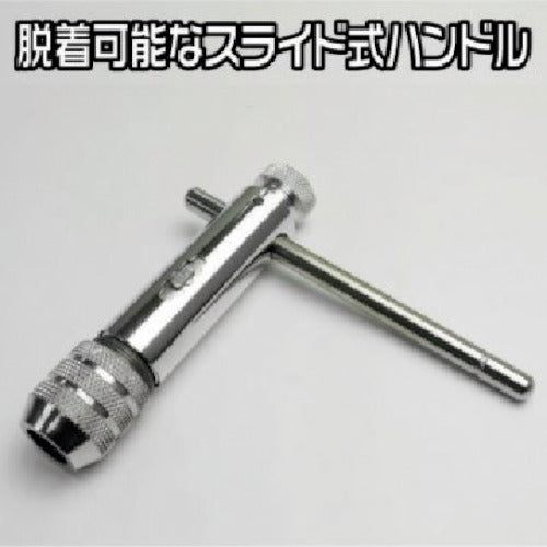 カタログ品番:2002000006837 特長:●タップやエキストラクターに使用する、ラチェットタイプのタップハンドルです。●左右回転方向の切替ができ、タップの切り戻しや逆ネジタップにも便利です。●ハンドル部をスライドさせることで、力を掛けやすくなります。 用途:●タップやエキストラクターに使用する、ラチェットタイプのタップハンドル 仕様:●適合タップ寸法:M5〜M12●全長(mm):110●全高(mm):25●本体サイズ(mm):L110×φ25●ハンドル長(mm):120●対応タップサイズ:M5〜M12 注意:●※パイプなどを差し込み、延長して使用しないでください。●※異なるサイズには使用しないでください。●※過度なトルクを掛けないでください。●※ハンマーで叩いたり、脚で踏んだりしないでください。