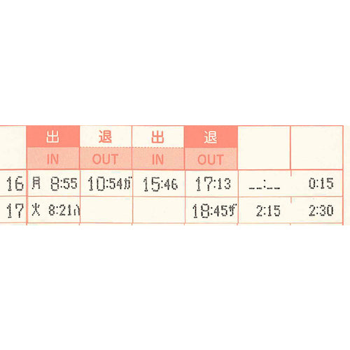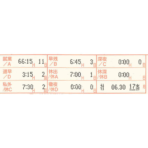 カタログ品番:MX-3000 特長:●クラウド接続できる電波時計搭載の時間集計タイムレコーダーです。●Wi-Fi接続により正確な時刻受信、打刻データ出力などお客様の管理をサポートします。●集計タイプ「社員モード(定時帯設定)」「時間帯パートモード(定時帯無し・4つの時間帯に分割)」「フリーパートモード(定時帯なし)」があります。●集計タイプ「時間帯パートモード」は、定時間帯がないモードで、1日を4つの時間帯にわけて集計可能です。●集計タイプ「フリーパートモード」は、社員モードのように定時時間帯は設定せずに、1日の中で就業時間数が基準時間数を超えた分を時間外実績として集計します。 用途:●社員パート・フリーパート・時間帯別パートの集計対応に。 仕様:●参照人数(人):打刻モード時:150/集計モード時:60●打刻数(回/日):4または8●幅(mm):156●奥行(mm):100●高さ(mm):236●タイプ:コネクテッドタイムレコーダー(時間集計タイプ)●カード登録人数(人):60●参照人数(人)打刻モード時:150●参照人数(人)集計モード時:60●適合タイムカード:アマノMX・MRXカード●印字:8欄印字(時刻記録時)もしくは4欄印字+集計●1年間保証対応●対応タイムカード:アマノMX・MRXカード●替インクリボンカセット:CE-320050●印字色:黒●印字:8打刻(時刻記録時)または4打刻+集計●参照人数:集計モード時/60名、打刻モード時/150名●集計モード:3タイプ(社員モード、時間帯パートモード、フリーパートモード)
