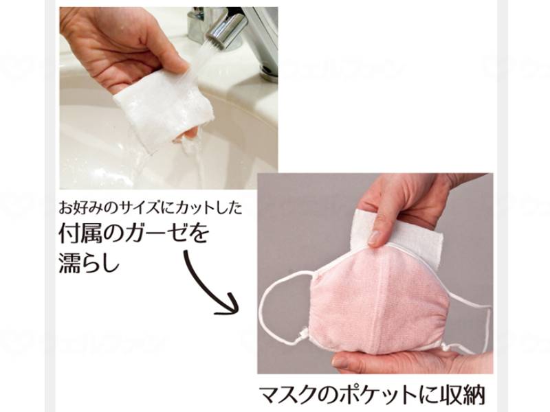 収納ガーゼに中の水分が呼吸により蒸気となり、のどを潤します。