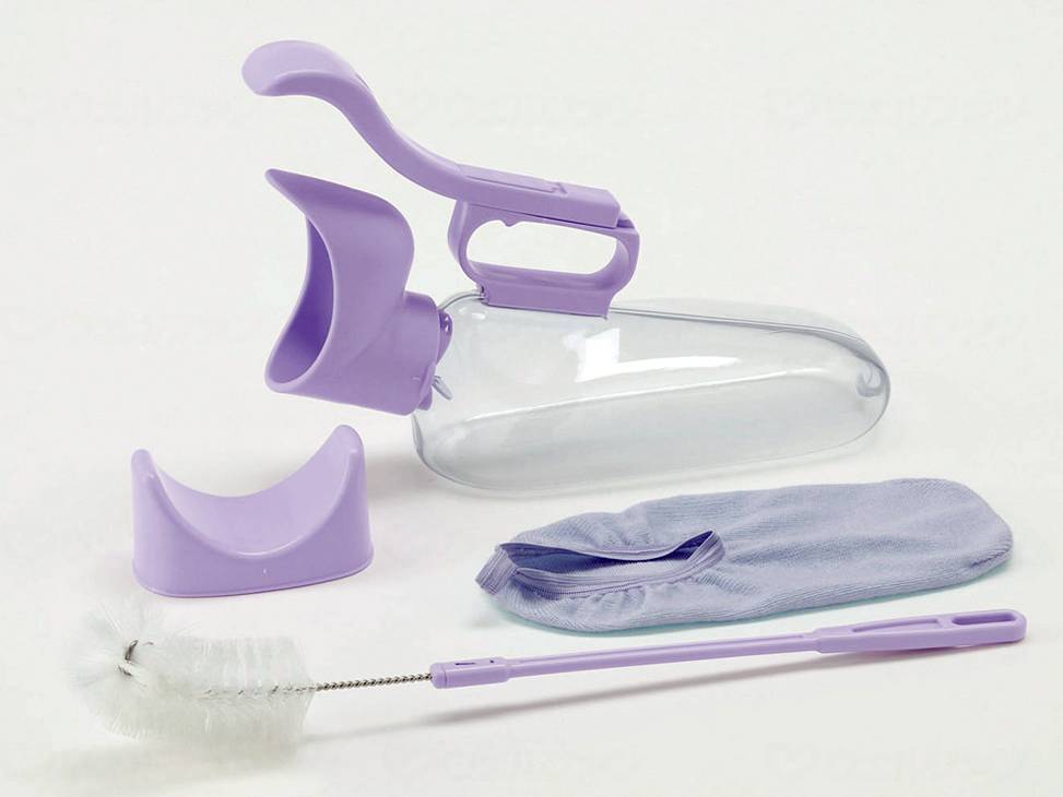 尿をとった後、股の間から抜き取る時や持ち運びの時など、万が一尿器が傾いても一気に流れ出さないように2つのこぼれ防止機能をつけました。(こぼれ防止弁、両受け形状)