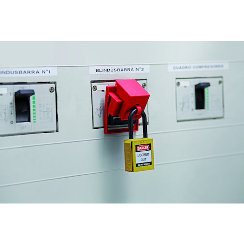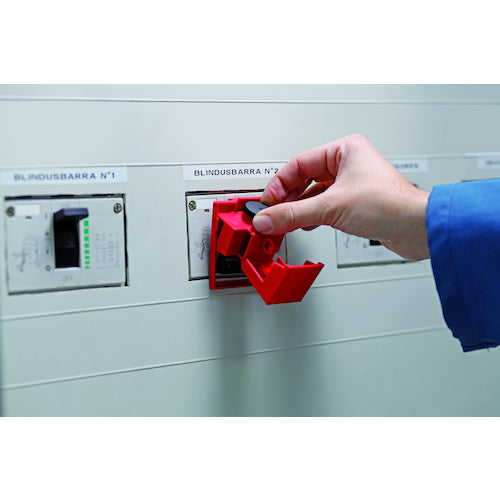 カタログ品番:090242 特長:●枠型ブレーカーのロックアウトに最適です。●ボルトはステンレス素材で丈夫です。●化学薬品と高温への耐性に優れています。●ノブ付きで締付けには工具不要です。 用途:●枠型ブレーカー用ロックアウトに。 仕様:●色:赤●高さ(mm):35●縦(mm):106●横(mm):95●適合ブレーカーレバー(mm)幅:46まで●適合ブレーカーレバー(mm)厚さ:25まで●取付パドロックシャックル径(mm):7.5 材質/仕上:●本体:ナイロン●ボルト:ステンレス
