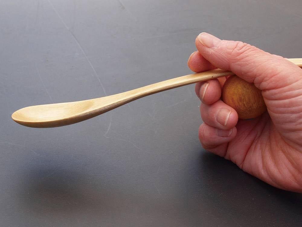 長い柄と、手のひらにスッポリと入る木の玉が、握った時に滑ったり落としたりしづらく、抜群の安定感をもたらします。