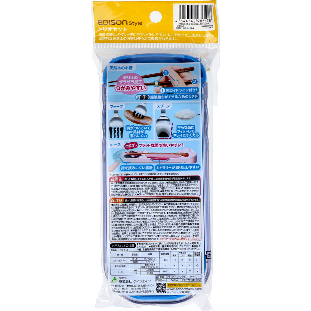 天然木のエジソンのお箸が入ったEDISON Styleの本格的トリオセット。 天然木のエジソンのお箸(指ガイドライン付き)とエジソンママのオリジナルフォークスプーンセット、スライド式専用ケース付きです。