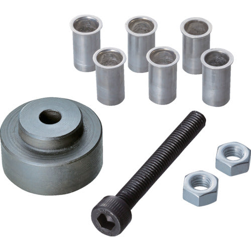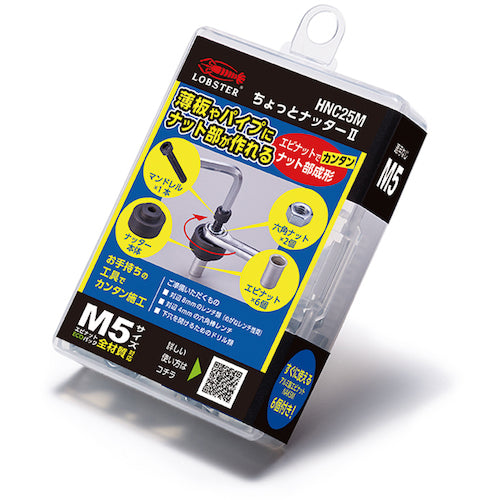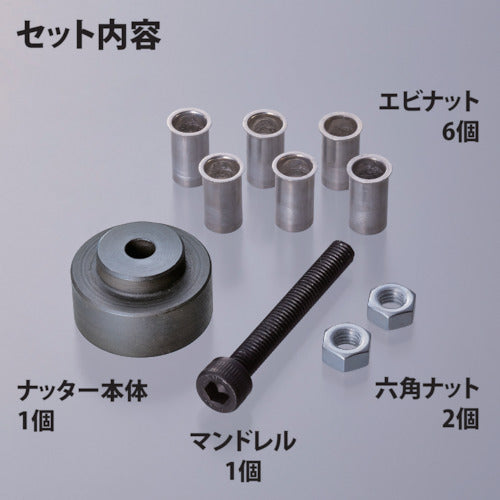 カタログ品番:HNC25M 特長:●手軽にブラインドナットが使える便利キットです。●「ちょっとナッター2」を使えば、面倒な設定や操作の必要がなく、誰でも簡単にエビナットの取り付けができます。●エビナットはナットとリベットの両方の長所を兼ねそなえた、ブラインドファスナーです。●タップ立ての難しい薄材やパイプ・溶接のできないプラスチック板にも片側から簡単に取り付けることができます。●スモールフランジタイプのエビナットも締結可能です。 用途:●車の鋼板部、樹脂部(バンパーなど)へのパーツ取り付けに。●エクステリアなどアルミ建材へのパーツ取り付けに。●薄板やパイプへの部品の取り付けに。●物置やフェンスに小物取り付けに。●自動車、オートバイ、自転車のカスタマイズに。 仕様:●全長(mm):12.5●適合ナット径:M5●適合ナット径(mm)アルミニウム・スチール:7●適合ナット径(mm)ステンレス:7●ナット使用範囲:M5●かしめ板厚(mm):1.0〜3.2●下穴径(mm):7.1●適合ねじ:M5×0.8●ナット外径(mm):8.0●セット内容:M5用ナッター本体 1個、マンドレル 1個、六角ナット 2個、アルミ製エビナット 6個●フランジ厚さ(mm):0.5●スモールフランジ●トルク強度:7.8N・m●ネジ山煎断強度:6.4kN 材質/仕上:●エビナット:アルミ(A5056) セット内容/付属品:●ナッター本体 1個、マンドレル 1個、六角ナット 2個、アルミ製エビナット 6個 注意:●ご使用の際、対辺8mmのメガネスパナと対辺4mmの六角棒レンチが必要です。●商品をご使用になられる前に、商品に添付の「取扱説明書」のすべてをよくお読みいただき、十分理解された上で正しくご使用ください。●締め過ぎにご注意ください。●エビナットのネジ部を破損する恐れがあります。●エビナットの適正かしめ板厚内でご使用ください。