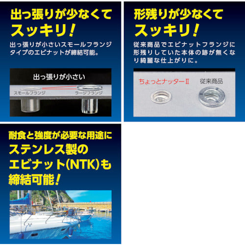 カタログ品番:HNC26M 特長:●手軽にブラインドナットが使える便利キットです。●「ちょっとナッター2」を使えば、面倒な設定や操作の必要がなく、誰でも簡単にエビナットの取り付けができます。●エビナットはナットとリベットの両方の長所を兼ねそなえた、ブラインドファスナーです。●タップ立ての難しい薄材やパイプ・溶接のできないプラスチック板にも片側から簡単に取り付けることができます。●スモールフランジタイプのエビナットも締結可能です。 用途:●車の鋼板部、樹脂部(バンパーなど)へのパーツ取り付けに。●エクステリアなどアルミ建材へのパーツ取り付けに。●薄板やパイプへの部品の取り付けに。●物置やフェンスに小物取り付けに。●自動車、オートバイ、自転車のカスタマイズに。 仕様:●全長(mm):14.6●適合ナット径:M6●適合ナット径(mm)アルミニウム・スチール:9●適合ナット径(mm)ステンレス:9●ナット使用範囲:M6●かしめ板厚(mm):1.0〜3.2●下穴径(mm):9.1●適合ねじ:M6×1.0●ナット外径(mm):10.0●セット内容:M6用ナッター本体 1個、マンドレル 1個、六角ナット 2個、アルミ製エビナット 6個●フランジ厚さ(mm):0.5●スモールフランジ●トルク強度:14.7N・m●ネジ山煎断強度:10.8kN 材質/仕上:●エビナット:アルミ(A5056) セット内容/付属品:●ナッター本体 1個、マンドレル 1個、六角ナット 2個、アルミ製エビナット 6個 注意:●ご使用の際、対辺10mmのメガネスパナと対辺5mmの六角棒レンチが必要です。●商品をご使用になられる前に、商品に添付の「取扱説明書」のすべてをよくお読みいただき、十分理解された上で正しくご使用ください。●締め過ぎにご注意ください。●エビナットのネジ部を破損する恐れがあります。●エビナットの適正かしめ板厚内でご使用ください。