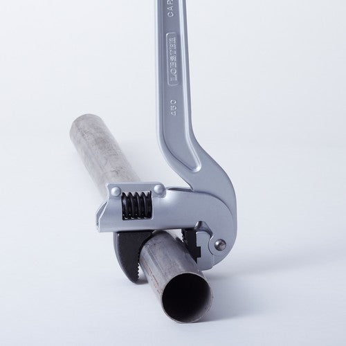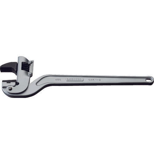 カタログ品番:ACW450 特長:●パイプレンチでは作業できない接地配管、隣接配管、溝中配管などの狭い場所での使用に最適です。●アルミ製で軽いため、楽に作業ができます。●フレームの開き角度が大きく、楽にパイプをくわえられます。 用途:●パイプのねじ込み・取り外し。●水道管、ガス管などの配管工事。 仕様:●くわえられる管呼び寸法:25〜50A●くわえられる管外径(mm):32〜70●全長(呼称)(mm):450●全長(mm):445●口開き幅(mm):70 材質/仕上:●本体:アルミ●歯部:スチール 注意:●パイプ等を継ぎ足して使用しないでください。●ハンマー代わりに使用したり、ハンマー等で叩いて使用しないでください。●歯の欠けや磨耗、目詰まりのあるときは使用しないでください。