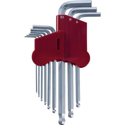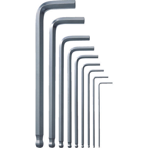 カタログ品番:BWM9S 特長:●特殊なボールポイント形状で直角、斜め(約20°)のいずれの使用でもボルト穴との接触面が大きくスリップしにくいです。●特殊合金鋼の採用と最適な熱処理により耐久性が抜群です。●傾けての使用で特に効果を発揮するため、狭所や奥深い隠れたところにあるねじの締緩作業に最適です。 仕様:●セット内容(mm):1.5、2.0、2.5、3.0、4.0、5.0、6.0、8.0、10.0●セット内容(本):9●対辺寸法(mm):1.5、2、2.5、3、4、5、6、8、10●対辺寸法×首下寸法×全長(mm)1.5:1.5×16×80.5●対辺寸法×首下寸法×全長(mm)2.0:2.0×17×88●対辺寸法×首下寸法×全長(mm)2.5:2.5×18×96.5●対辺寸法×首下寸法×全長(mm)3.0:3.0×20×104●対辺寸法×首下寸法×全長(mm)4.0:4.0×25×114●対辺寸法×首下寸法×全長(mm)5.0:5.0×28×125●対辺寸法×首下寸法×全長(mm)6.0:6.0×32×139●対辺寸法×首下寸法×全長(mm)8.0:8.0×36×162●対辺寸法×首下寸法×全長(mm)10.0:10.0×40×182●首下寸法(mm):79、86、94、101、110、120、133、154、172●対辺(mm):1.5、2、2.5、3、4、5、6、8、10●全長(mm):80.5、88、96.5、104、114、125、139、162、182 材質/仕上:●特殊合金鋼 セット内容/付属品:●ボールポイント六角棒レンチ9本、ホルダ●ホルダ