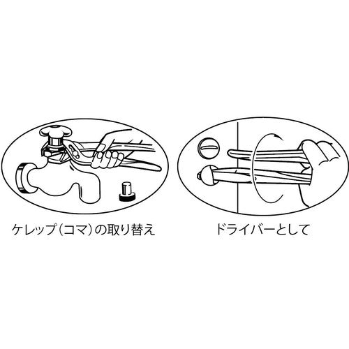カタログ品番:WP250ND 特長:●ハンドルにマイナスドライバー付きで、バール的な使い方も可能です。 用途:●水道の蛇口など水回り作業、パイプなどの配管作業に。●栓やビンのフタなどの開閉、線材のねじり・曲げ・引っ張りに。●バール的な使い方もできるように特殊鋼に特殊熱処理で加工●線材のねじり・曲げ・引っ張り●ドライバー部でのネジの締め付け、取り外し●ケレップ(コマ)の取り換え 仕様:●最大口開き(mm):46●全長(mm):257●調整(段階):5●先端厚さ(mm):10.3●口幅調整5段階で、水まわり作業に便利●ふところ(mm):36 材質/仕上:●本体:スチール 注意:●作業前に必ず、取扱説明書をよくお読みいただき、十分理解された上で正しくご使用ください。●寸法・重量などは公称値ですので、多少の数値の上下があります。●口幅調整は確実に切り換わっていることを確認してから使用してください。●不安定なくわえかたをしないでください。すべって手などを挟むことがあります。●柄端のドライバー部で手や身体などを傷つけないようご注意ください。