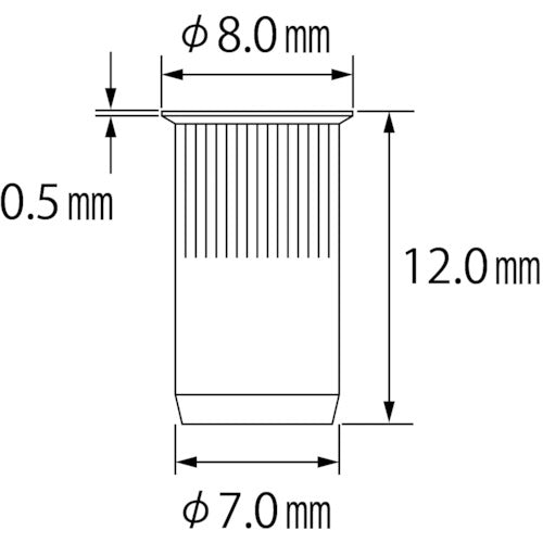 カタログ品番:NSK5MR 特長:●ソフトなセッティングで薄板、軟質母材用に最適です。●先端テーパーになっていますので、下穴に入りやすく自動打ちなどに最適です。●胴部に入ったローレットにより、母材をガッチリグリップしますので、供回りがしにくくなっています。(但し条件によります) 用途:●車の鋼板部、樹脂部(バンバーなど)へのパーツ取り付けに。●エクステリアなどアルミ建材へのパーツ取り付けに。●薄板にアクセサリーの取付け、パイプと平板の接続、農具・器具の水平出し等に 仕様:●かしめ板厚(mm):0.5〜2.5●下穴径(mm):7.1●適合ねじ:M5×0.8●ナット外径(mm):7.0●全長(mm):12.0●フランジ厚さ(mm):0.5●パック入数(個):1000●箱入 材質/仕上:●スチール(SWCH) 注意:●適正かしめ板厚、下穴径は当社指定寸法を守り安全率を十分に考慮して施工してください。●作業前に必ず、ご使用になるリナッターの取扱説明書をよくお読みください。●寸法・重量などは公称値ですので、多少の数値の上下があります。