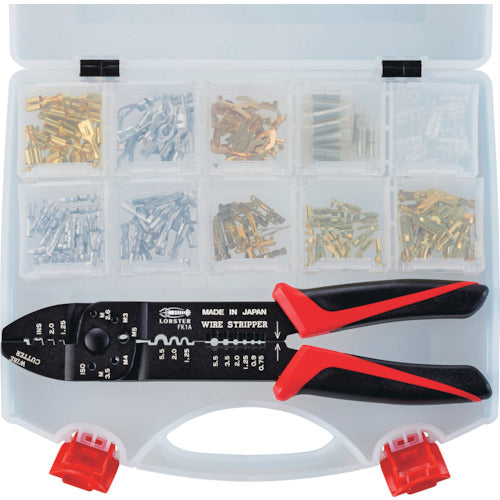 カタログ品番:T115A 特長:●グリップにはエラストマー樹脂を採用しています。●ボルトをカットする時も、握りやすく手が痛くなりにくいグリップです。●オープンバレル端子・圧着端子の圧着、ボルト・電線の切断、電線の被覆むきが1丁でできます。●使用頻度が高い差込端子を中心にしたキットです。 用途:●自動車の整備に。●工場のメンテナンスに。●制御機器の配線用。●電話・電信の配線用。●オーディオ・テレビ・家電機器のメンテナンスに。●工作や各種ホビー向け。 仕様:●全長(mm):235●圧着端子:オープンバレル端子●圧着端子([[MM2]]):1.25、2●圧着端子([[MM2]])裸端子用:1.25、2、5.5●圧着端子([[MM2]])Bスリーブ:1.25、2、5.5●ボルトカッター:M2.6〜M5●ワイヤーストリッパー[[MM2]]:0.75〜5.5●圧着端子([[MM2]])オープンバレル端子:1.25、2●オープンバレル端子/裸圧着端子(P・B)スリーブ用 セット内容/付属品:●電装圧着工具 FK1A●ギボシ型端子M(20個)●ギボシ型端子F(20個)●110シリーズM(20個)●110シリーズF(20個) 注意:●活線(電気が流れている線)には使用しないでください。●屋内配線などの重要な圧着には使用しないでください。●摺動部には定期的に注油してください。●摩擦・ガタを防ぎます。