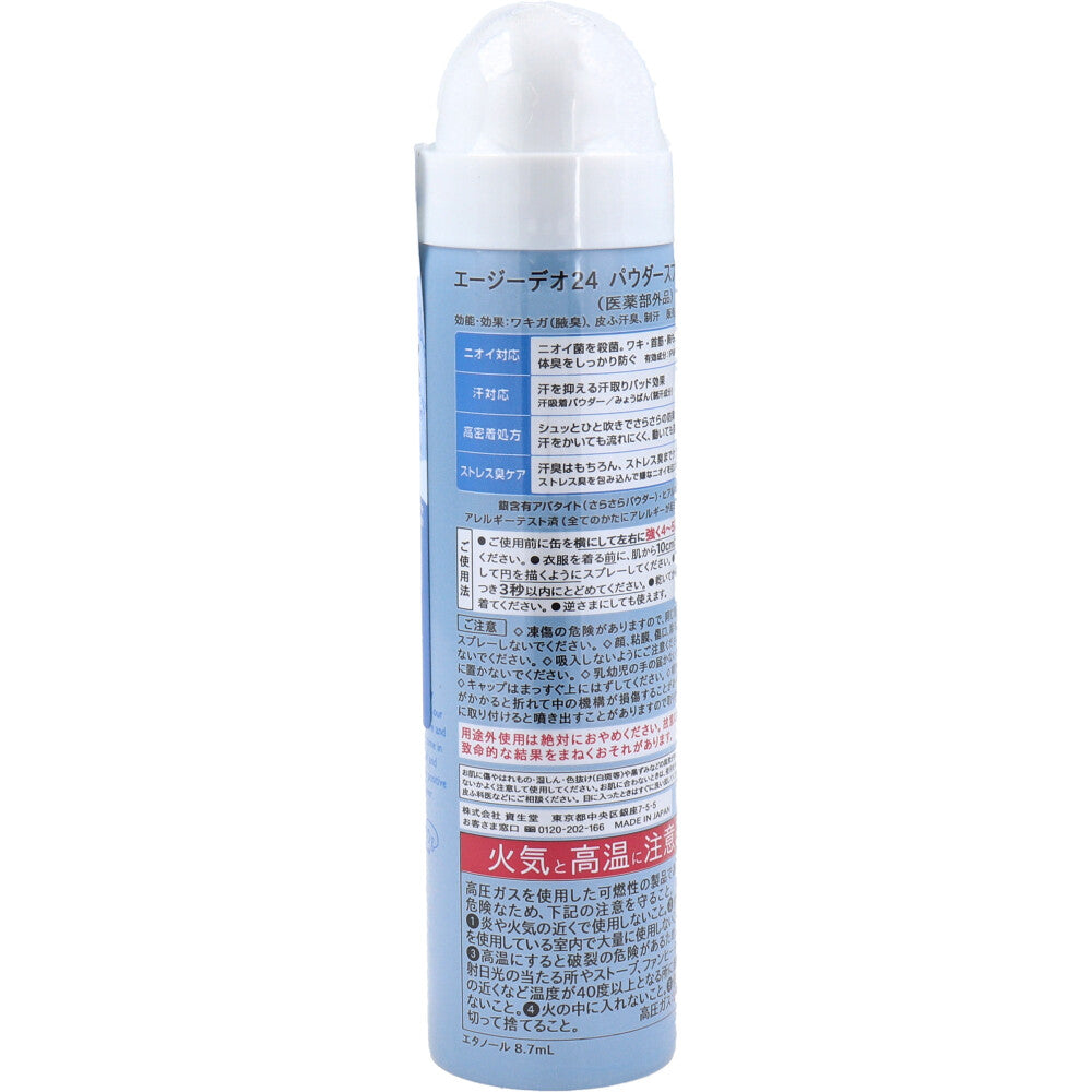 ふんわりいい香り続く♪ 24時間、肌快適ケア いつでもどこでもずーっと快適な肌を願う人へ。 ニオイ菌を断つ! ●ニオイ対応 ニオイ菌を殺菌!ワキ・首筋・胸もと・背中など、全身の汗のニオイや体臭をしっかり防ぐ。 ※有効成分:IPMP(イソプロピルメチルフェノール) ●汗対応 汗を抑える汗取りパッド効果。 ※汗吸着パウダー/みょうばん(制汗成分) ●高密着処方 シュッとひと吹きでさらさらの防臭ヴェールを形成。 汗をかいても流れにくく、動いても落ちにくい処方で肌にピッタリ密着。 ●ストレス臭ケア 汗臭はもちろん、ストレス臭までケア。 ストレス臭を包み込んで嫌なニオイを目立たなくするSTハーモナージュ香料配合 ●銀含有アパタイト(さらさらパウダー)・ヒアルロン酸パウダー(保湿)配合。 ●アレルギーテスト済(全ての方にアレルギーが起きないというわけではありません。) ●透き通るピュアでやさしい花の香り ヴァンミニョン。 ↓↓エージーデオ24シリーズ一覧はこちら↓↓ 【医薬部外品】 販売名:パウダースプレー h (VM) 【成分】 ★有効成分 イソプロピルメチルフェノール、焼ミョウバン ★その他の成分 アパサイダーC、ヒアルロン酸ナトリウム(2)、合成ケイ酸ナトリウム・マグネシウム、濃グリセリン、液化石油ガス、無水エタノール、タルク、メチルフェニルポリシロキサン、無水ケイ酸、パルミチン酸2-エチルヘキシル、ポリオキシエチレン・メチルポリシロキサン共重合体、ステアリン酸カルシウム、被覆粉末EZ(酸化亜鉛)、香料 【効能・効果】 ワキガ(腋臭)、皮ふ汗臭、制汗 【使用方法】 ・ご使用前に缶を横にして左右に強く4~5回振ってください。 ・衣服を着る前に、肌から10cm以上はなして円を描くようにスプレーしてください。 ・1カ所につき3秒以内にとどめてください。 ・乾いてから衣服を着てください。 ・逆さまにしても使えます。 【火気と高温に注意】 ★高圧ガスを使用した可燃性の製品であり、危険なため、下記の注意を守ること。 ・炎や火気の近くで使用しないこと。 ・火気を使用している室内で大量に使用しないこと。 ・高温にすると破裂の危険があるため、直射日光の当たる所やストーブ、ファンヒーターの近くなど温度が40度以上となるところに置かないこと。 ・火の中に入れないこと。 ・使い切って捨てること。 ※高圧ガス:LPG【ご注意】 ・用途外使用は絶対におやめください。 ・故意に吸入すると窒息など致命的な結果をまねくおそれがあります。 ・凍傷の危険がありますので、同じ箇所に連続して3秒以上スプレーしないでください。 ・顔、粘膜、傷口、除毛直後にはお使いにならないでください。 ・吸入しないようにご注意ください。 ・缶がさびると破裂の原因になりますので、湿気の多いところに置かないでください。 ・乳幼児の手の届かないところに置いてください。 ・お肌に傷やはれもの・湿しん・色抜け(白斑等)や黒ずみなどの異常が生じていないかよく注意して使用してください。 ・お肌に合わないときは、使用を中止し、皮ふ科医などにご相談ください。 ・目に入ったときはすぐに洗い流してください。