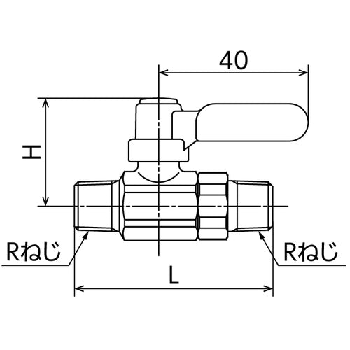 カタログ品番:M3-10MLR 特長:●省スペースボールバルブです。●配管都合によりハンドル位置・開閉方向を自由に変更できます。 用途:●冷温水・油・空気用。 仕様:●呼び径A:10●呼び径B:R3/8 x R3/8●全長(mm):56●高さ(mm):30.5●ハンドル長D(mm):40●最高許容圧力(MPa):1.0●使用温度範囲(℃):-20〜80●適合流体:冷温水・油・エアー●内径(mm):7.5●許容圧力:1.0MPa(-20〜80℃)●Rねじ×Rねじ 材質/仕上:●黄銅(C3771BE)