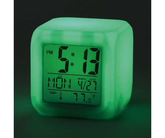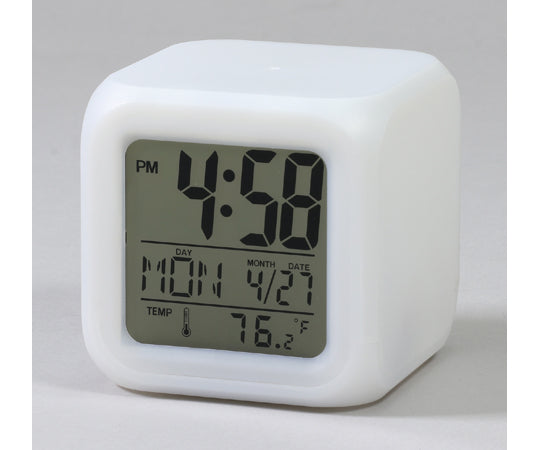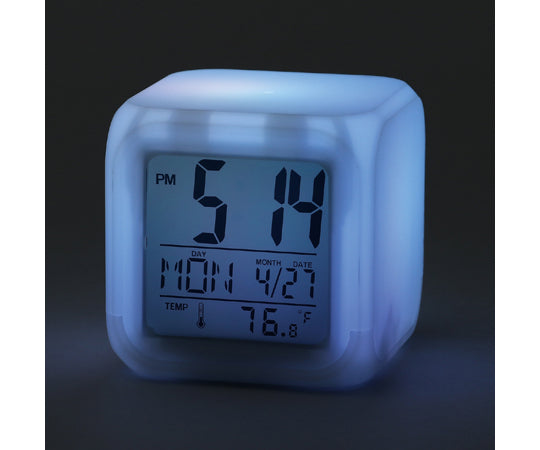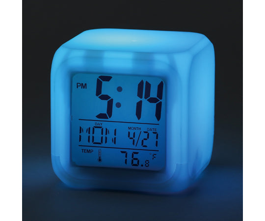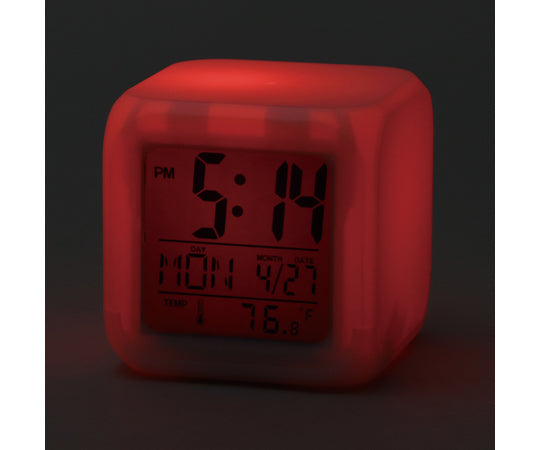 ライトが7色に変化する! 8種のアラーム音付のデジタル置き時計です。商品サイズ:79×79×78mm 重量:119g 材質:ABS 包装形態:化粧箱 包装サイズ:80×80×80mm