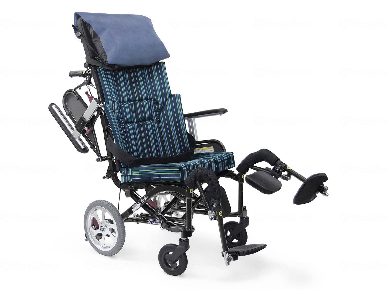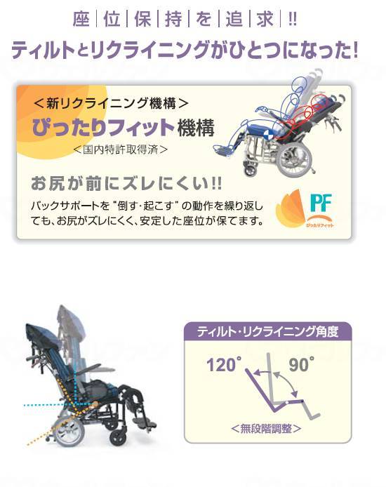 メーカー品番:「KPFK-12」 TAIS:「00160-000250」 コメント 操作しやすい便利な機能 1.すきまレスピロー 大粒ビーズが頭部の動きに追従し、しっかりと保持します。左右に取り付けられたアジャスタのヒモを引くだけで枕の厚さを簡単に変えられます。(約9cm~17cm) 左右独立して厚さ調節ができるため、様々な姿勢に合わすことができます。 2.スキニーズベルト 背中の張り調整部に伸縮する部分を設けました。その上、リクライニングしてもベルトがある程度身体に追従しフィットします。 「スキマ」を見ながらベルトの張り調整が簡単にできます。 3.フットサポート[エレベーティング機構/角度可変式ステップ板] 着脱式エレベーティング機構で無段階で調整可能です。ステップの角度を調整できるので足首の伸展にも対応できます。 4.コンパクト設計 全幅56.5cmなので一般的な住宅の廊下幅でも取り回し可能です。 5.アームサポート[跳ね上げ+高さ調整] 移乗に便利な跳ね上げ機構を採用しました。高さ調節レバーを後方にもってくることにより誤操作を防ぎます。操作部は認識しやすいカラーリングにしました。 車輪12インチハイポリマータイヤ 低床 キャスタ6インチ 座位保持を追求!! ティルトとリクライニングがひとつになった! 〈新リクライニング機構〉ぴったりフィット機構 お尻が前にズレにくい!! バックサポートを“倒す・起こす”の動作を繰り返しても、お尻がズレにくく、安定した座位が保てます。 規格詳細 全高1200×全幅565×全長980(mm) 折りたたみ時:全高770×全幅350×全長720(mm) 座幅:420(mm) 前座高:400(mm) 後座高:370(mm) シート奥行:375(mm) 肘当て高さ:190/210/230/250/270/290(mm) バックサポート高:850(mm) 押し手高:935 フットサポート・シート間距離:320~ 重量:21.5kg 可動角:30°