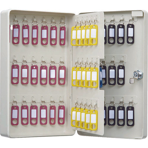 カタログ品番:CKB-C68-I 特長:●オフィスや倉庫での鍵の管理に適したシリンダータイプのキーボックスです。●カラフルなキーホルダーで鍵を分類して管理可能です。●キーホルダーごとにネームシートが付いており、取り間違いを防ぎます。●収容効率に優れたコンパクトサイズで、省スペースでの保管が可能です。●本体裏側に壁掛け用の穴があり、付属のねじとコンクリート用プラグを使うことで壁に取り付けられます。 仕様:●間口(mm):207●奥行(mm):80●高さ(mm):330●ホルダ数(個):68●色:アイボリー●タイプ:コンパクト設計●鍵収納数68個●シリンダ錠式(開錠用キー2個付)●キーホルダー:赤×21個、青×15個、黄×15個、黒×17個入●壁掛け用穴付(3ヶ所) 材質/仕上:●本体:スチール●キーホルダー:ポリプロピレン(PP) セット内容/付属品:●取付用ネジ3本●コンクリート用プラグ3個