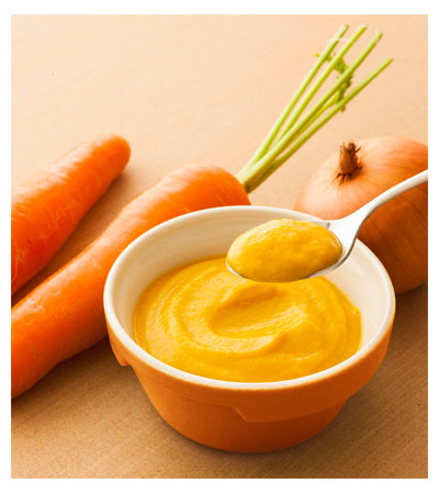 ・にんじんとじっくり炒めて甘みをひきだした玉ねぎをなめらかに裏ごししました(にんじん25%使用)。