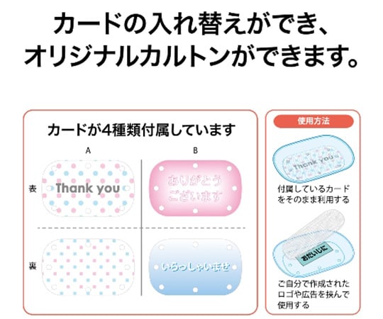 付属のデザインカード以外にも、オリジナルのロゴや広告を挟んで使用できます。色:青 サイズ(mm):215×150×31 材質:本体/PS(ポリスチレン)、マット/PVC(塩化ビニル樹脂) 付属品:デザインカード×4枚