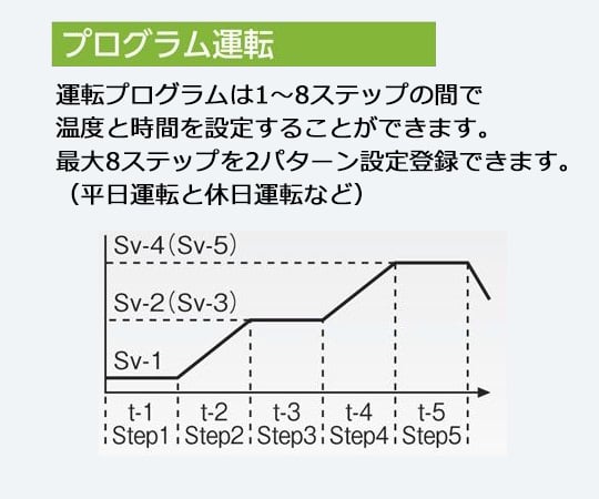 機能:プログラム運転(8ステップ、2パターン)連続繰り返し(1ステップ0~99時間・メモリバックアップ約48時間