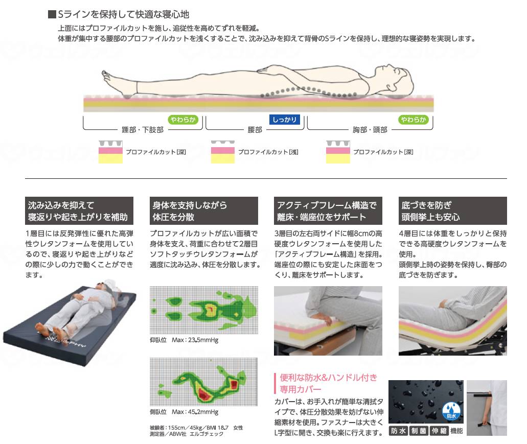 上面にはプロファイルカットを施し、追従性を高めてずれを軽減。体重が集中する腰部のプロファイルカットを浅くすることで、沈み込みを抑えて背骨のSラインを保持します。また、反発弾性に優れた高密度・高弾性ウレタンフォームを使用しているので、寝返りや起き上がりを補助します。