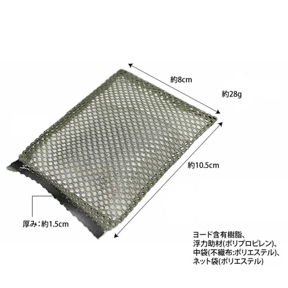 ヨード含有樹脂、浮力助剤(ポリプロピレン)、中袋(不織布:ポリエステル)、ネット袋(ポリエステル)