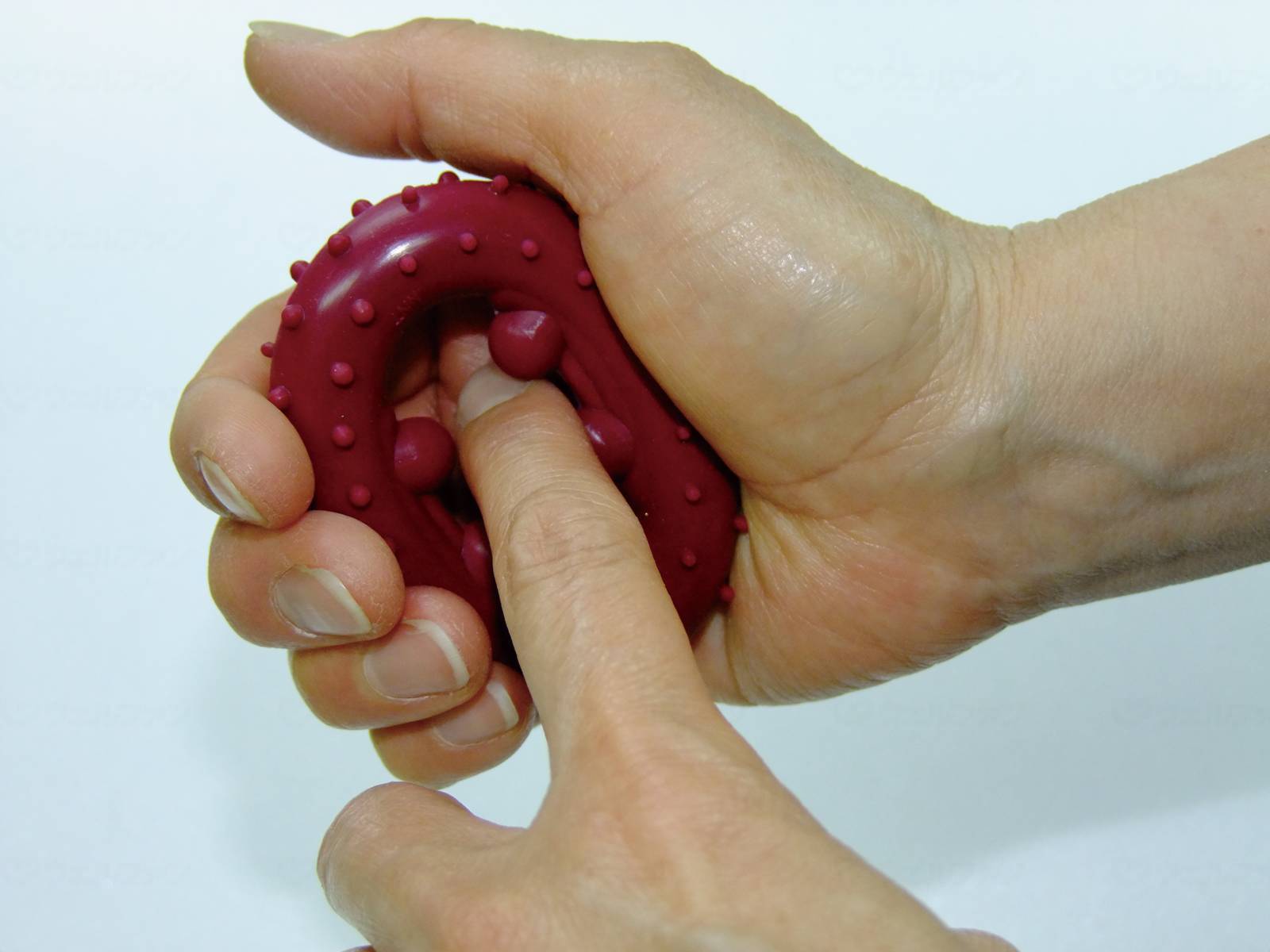 右手又は左手でグリップを握り、内側の突起部に反対の手の指の爪の生え際をはさんで、強弱つけて刺激して下さい。