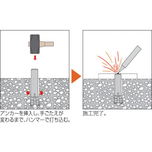 カタログ品番:HAS-1060 特長:●各種金物の溶接ができます。 用途:●コンクリート用●ドア枠・窓枠の取付けなど 仕様:●外径(mm):10.0●全長(mm):60●ドリル径(mm):10.5●埋込深さ(mm):40●引張最大荷重(kN):12.7●外径D(mm):10●全長L(mm):60●穿孔深さ(mm):45●箱入 材質/仕上:●スチール 注意:●引張最大荷重は、コンクリート強度Fc=21N/[[MM2]]時の値です。●下穴の切粉は必ず除去してください。●本体にコーンがついているか確認して、下穴にセットしてください。●施工は手ごたえが変わるまで確実に行ってください。